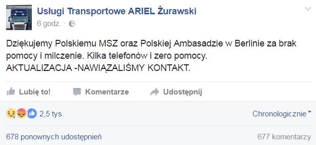 – Dziękujemy Polskiemu MSZ oraz Polskiej Ambasadzie w Berlinie za brak pomocy i milczenie. Kilka telefonów i zero pomocy – napisał na jednym z portali społecznościowych właściciel firmy, do której należała uprowadzona przez islamskich terrorystów ciężarówka.