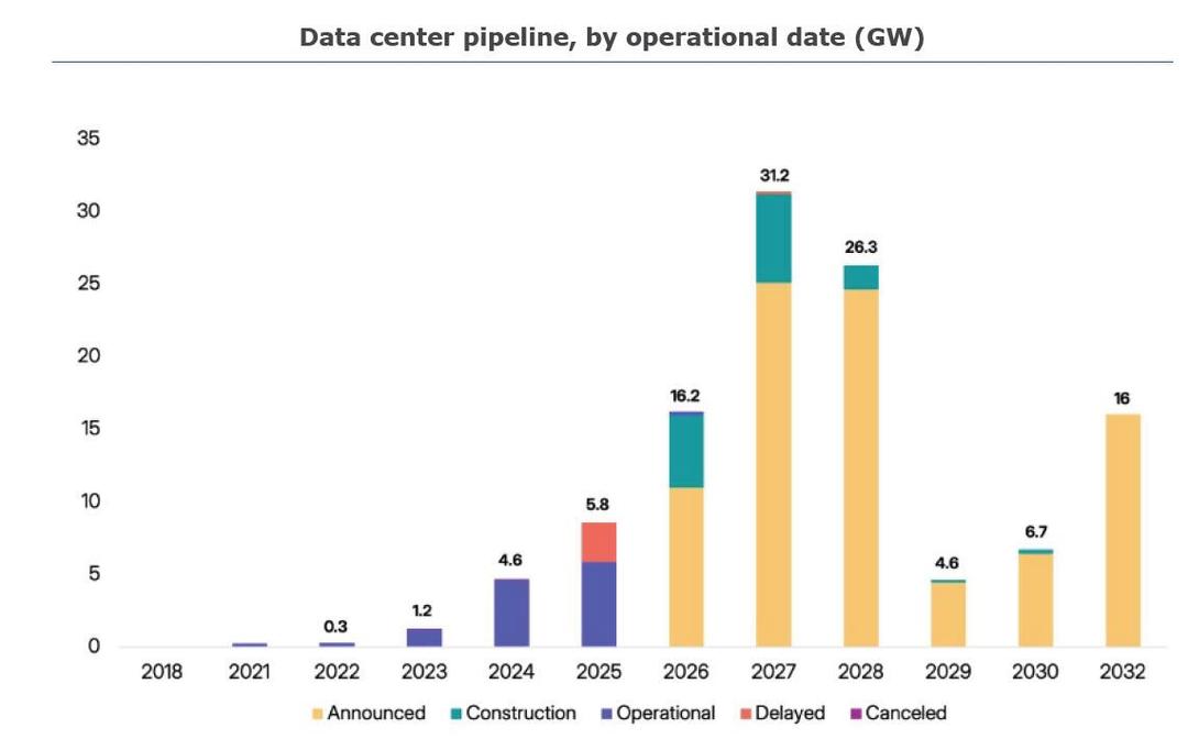 „Spodziewamy się, że 30–50% projektów na rok 2026 ulegnie opóźnieniu z powodu ograniczeń energetycznych (25% projektów nie ujawniło strategii zasilania), coraz większego sprzeciwu społeczności lokalnych oraz potencjalnych niedoborów sprzętu sieciowego. 11 GW mocy na rok 2026 pozostaje na ogłoszonym etapie bez oznak budowy, pomimo typowego czasu budowy wynoszącego od 12 do 18 miesięcy. Uruchomienie tych mocy jest nadal możliwe, ale wymagałoby to drastycznego przyspieszenia”.