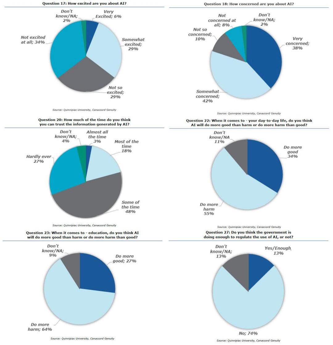 Te zmiany instytucjonalne rzeczywiście następują, ponieważ niedawny sondaż Uniwersytetu Quinnipiac – analizujący wykorzystanie sztucznej inteligencji i jej wpływ na życie codzienne, edukację i opiekę zdrowotną – potwierdził, że społeczeństwo jest coraz bardziej nieufne wobec pogłębiającej się integracji sztucznej inteligencji z opieką zdrowotną, edukacją i życiem codziennym. Oto niektóre z ustaleń pokazujących, jak szybko nastroje społeczne odwróciły się od sztucznej inteligencji: